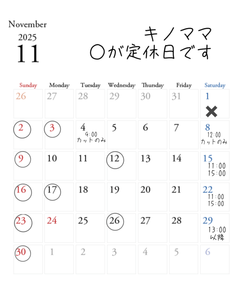 11月定休日、今の空き情報になります